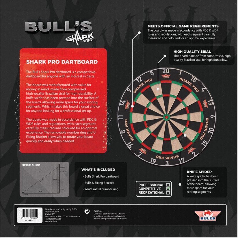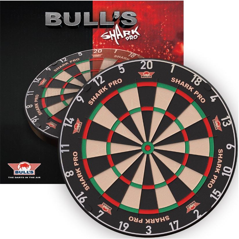 Het Bull’s Shark Pro dartbord is een superfijn dartbord met professioneel ingelegd blades  (messendraad). Dit mooie professionele instapmodel dartbord is perfect voor horeca en thuisgebruik. Het bord wordt geleverd met een geavanceerd ophangsysteem Rotate Bracket.